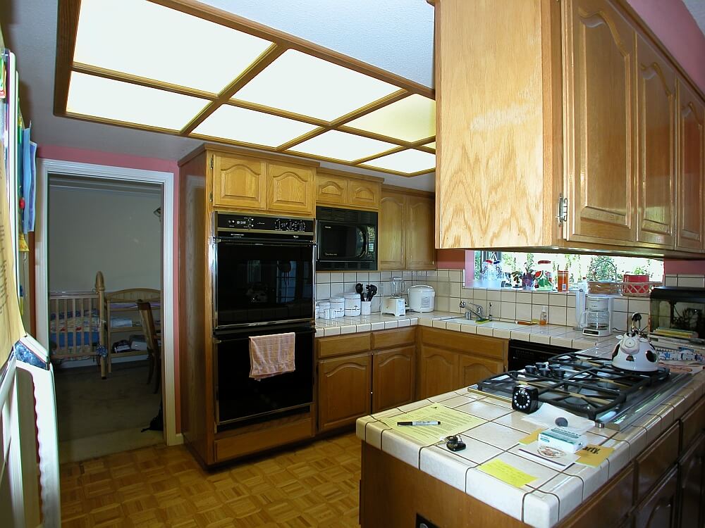 Dated lighting was removed and the ceiling raised. Recessed cans, under cabinet task lights and pendant fixtures provide flexible lighting solutions.