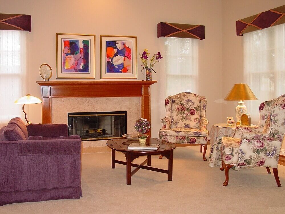 Custom cornices of colorful silks create a dramatic back drop to the formal living room. Sheer textured Roman shades provide privacy while washing the space with a soft glow.