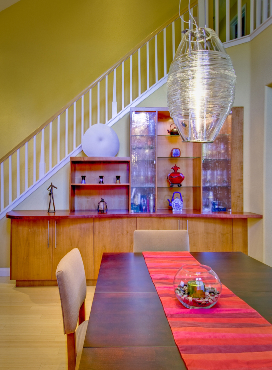 The custom cabinetry serves as buffet, vitrine, and toy storage.
