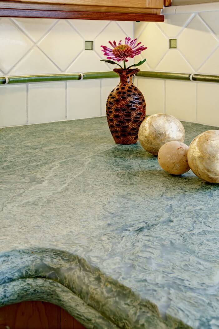 Granite counter in leather finish plays off the new backsplash of hand crafted ceramic andglass accent tiles.