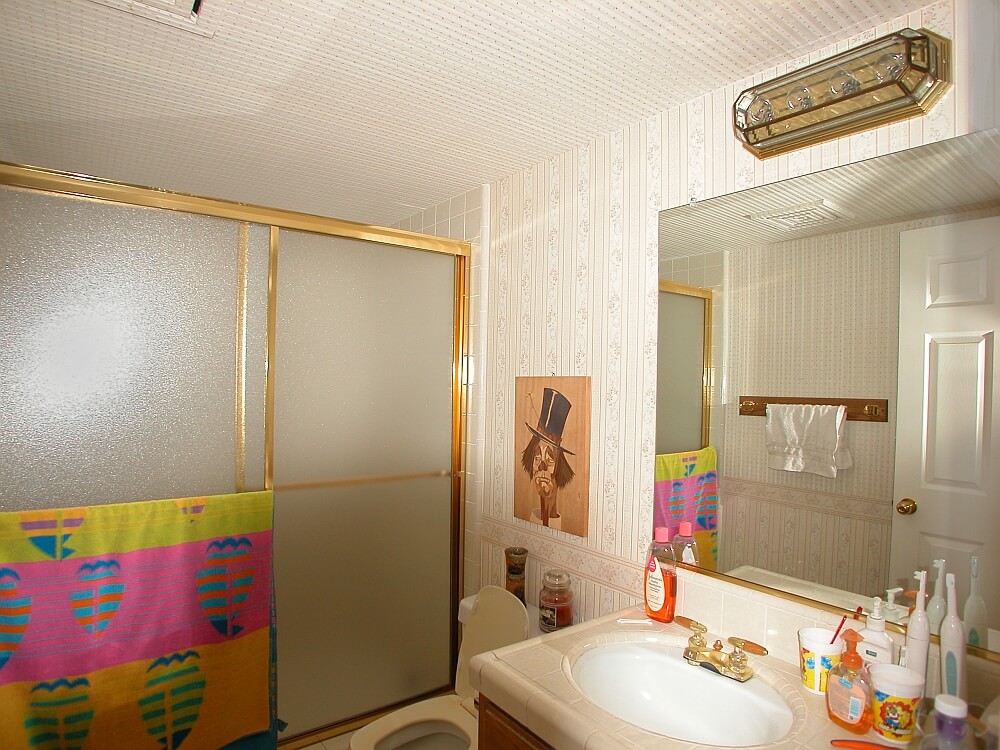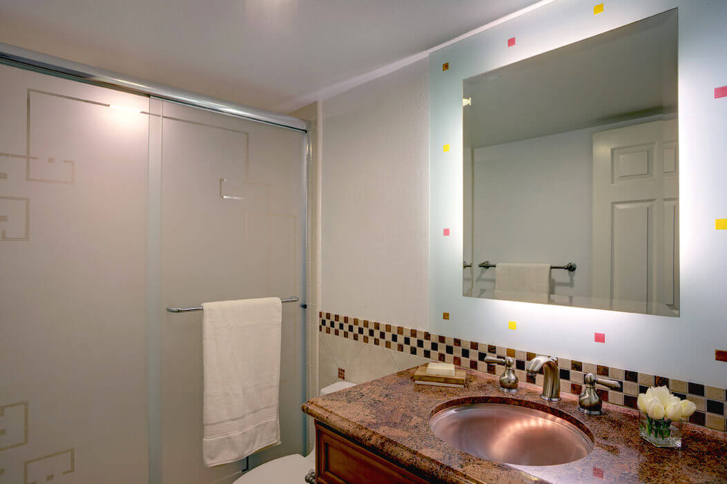 Custom designed mirror and shower doors of Saratoga bathroom take their cue from the geometric tile spash.