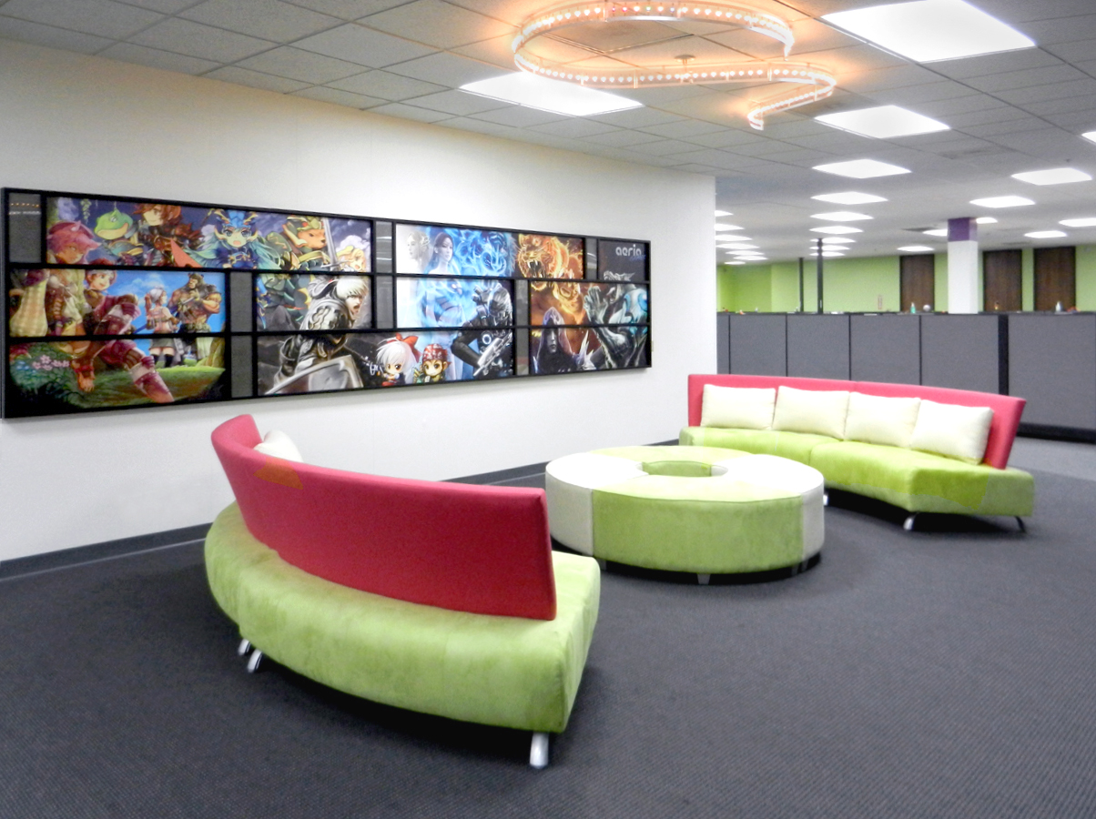 Custom lighting is designed to mirror the company logo in the break area. The retro funk modular seating allows easy regrouping for impromptu meetups.