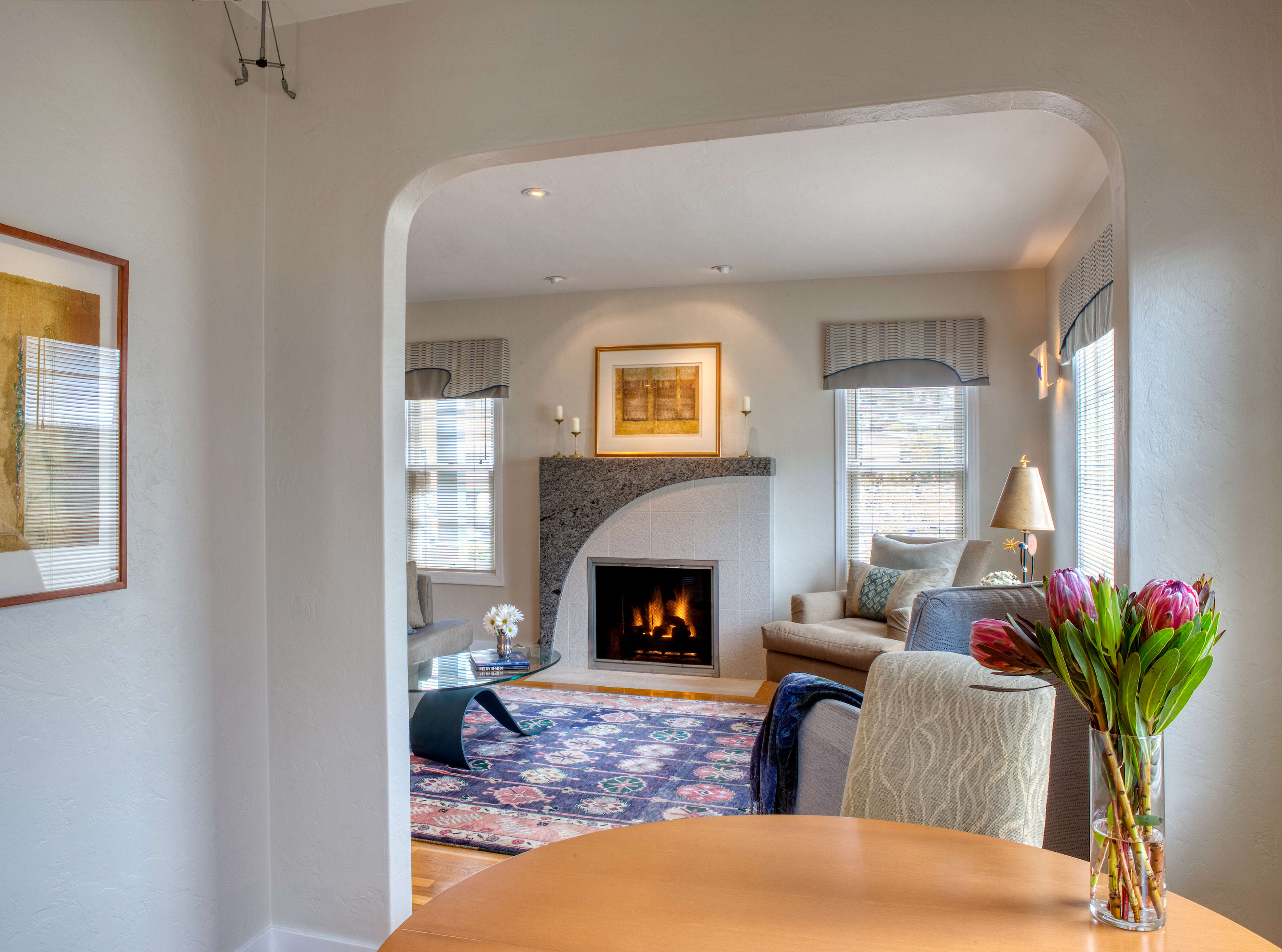 Sculptural granite and tile fireplace surround plays against the valences' dynamic curves.