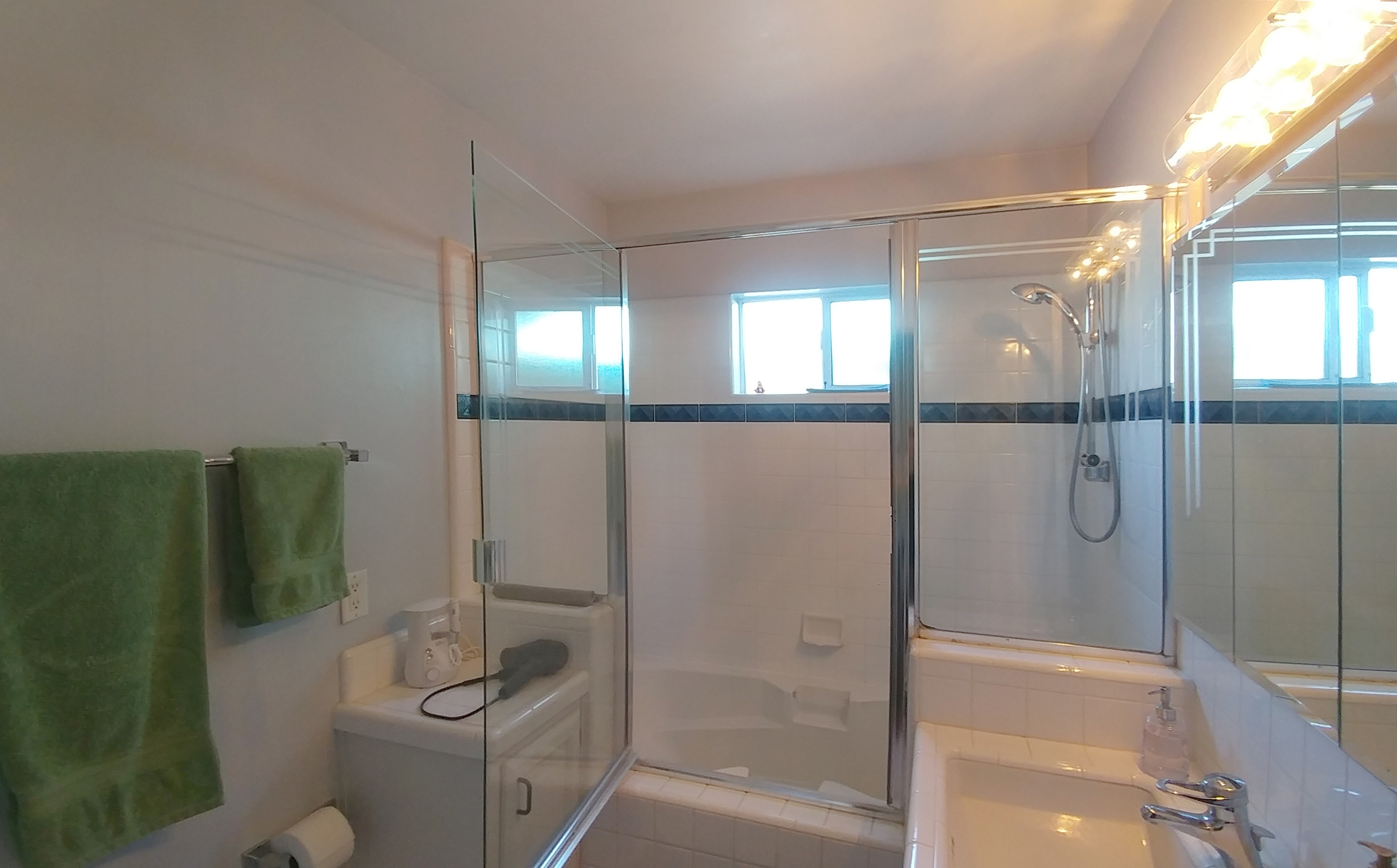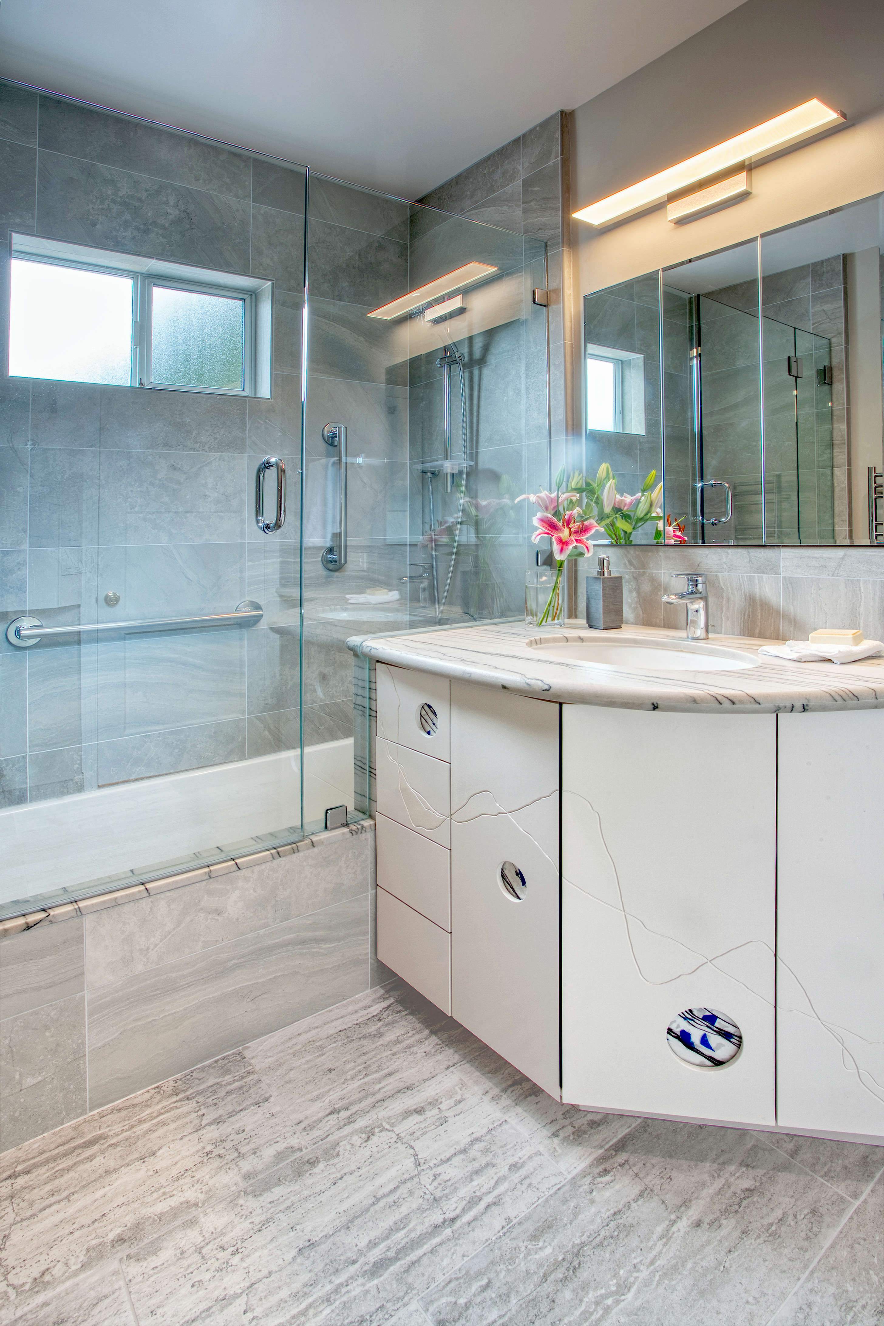 Drawer and doors of custom vanity sporting sculptural lines and art glass accents add creative elegance to the master bathroom.