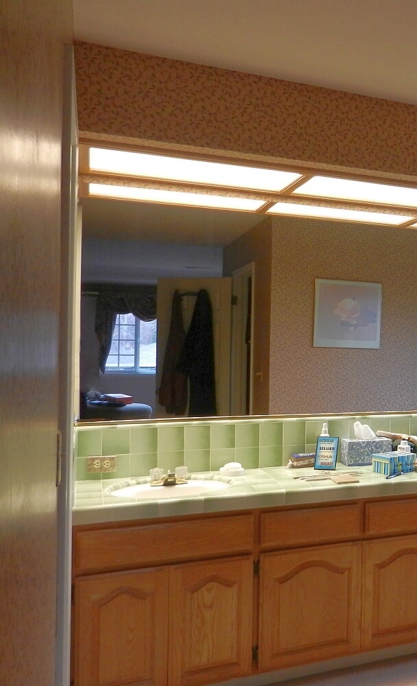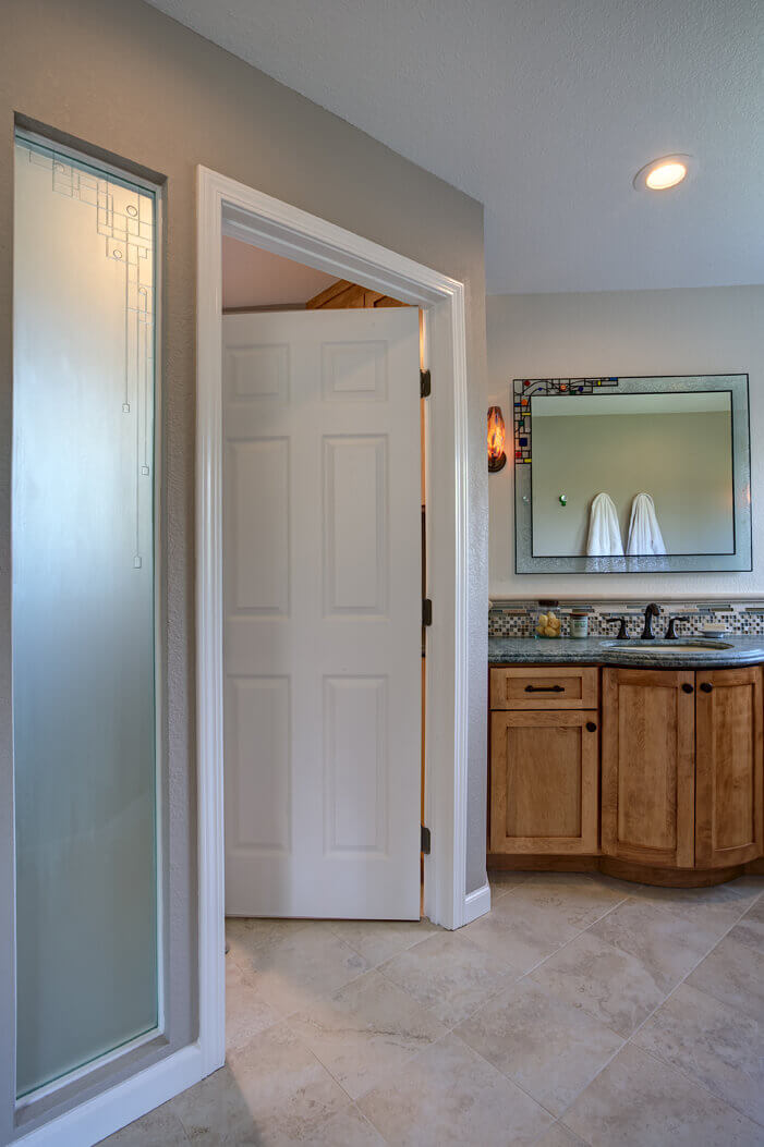 Translucent sandblasted sidelight echoes the mirror's geometric design and gives the master bathroom an ethereal feel.