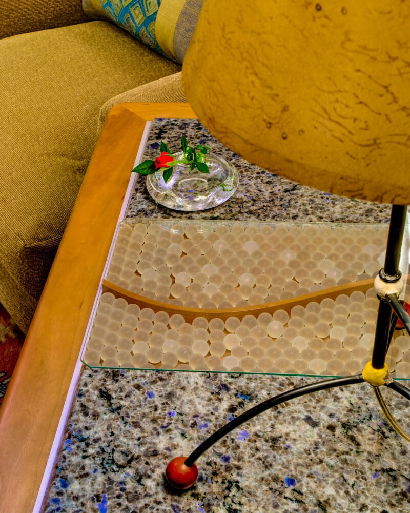 Custom media storage/coffee table top sports a collage of polished granite, frosted glass, and curved wood.