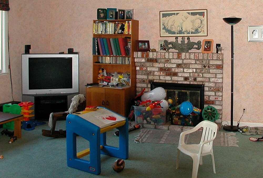 Flanked by custom built‐in cabinets, the fireplace surround dresses up the family room, creating focus while providing a unifying palette.