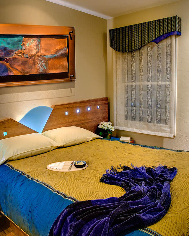 The smooth curves of the valence act as a counterpoint to the angular lines of the headboard while the textured, sheer roman shade screens the exterior views.