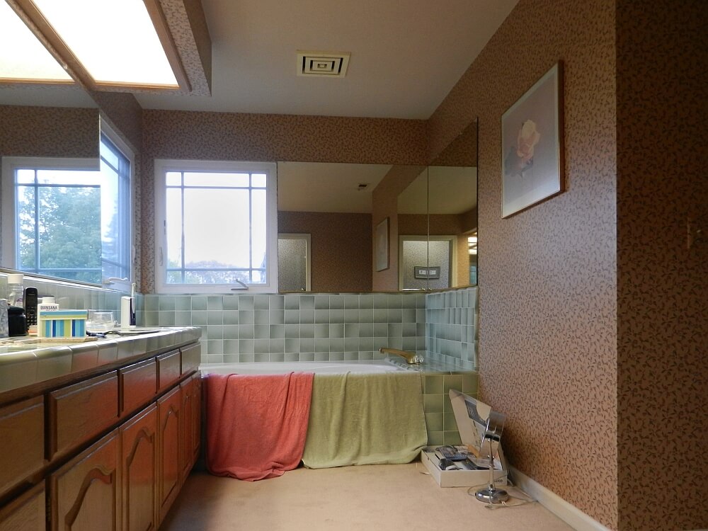 Polychromatic faux-stained glass corner is capped by a frosted silver-flecked ribbon to complement the spa tones of the tile splash.