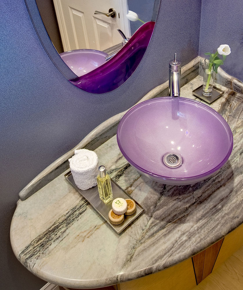 The curvilinear theme carries onto the splash and custom mirror which has been carved, polished and colored to co-ordinate with the wall covering, granite and sink.
