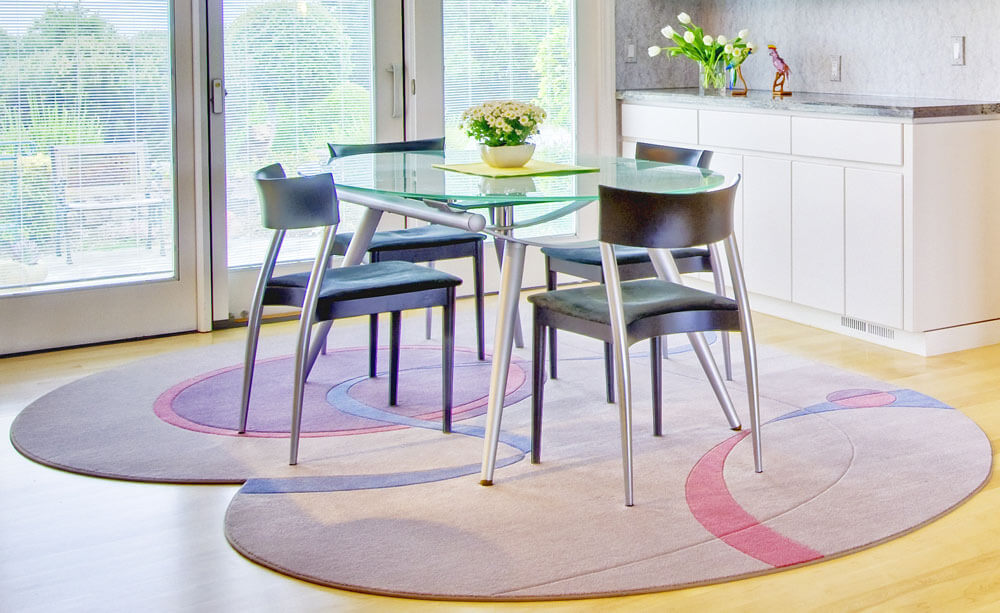 Custom rug is designed to reinforce the curvilinear design and color scheme of the space.