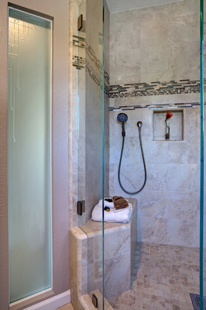 Pentagonal bathing space features intricate tile work with a built‐in bench and overhead shower to invite sybaritic pursuits.