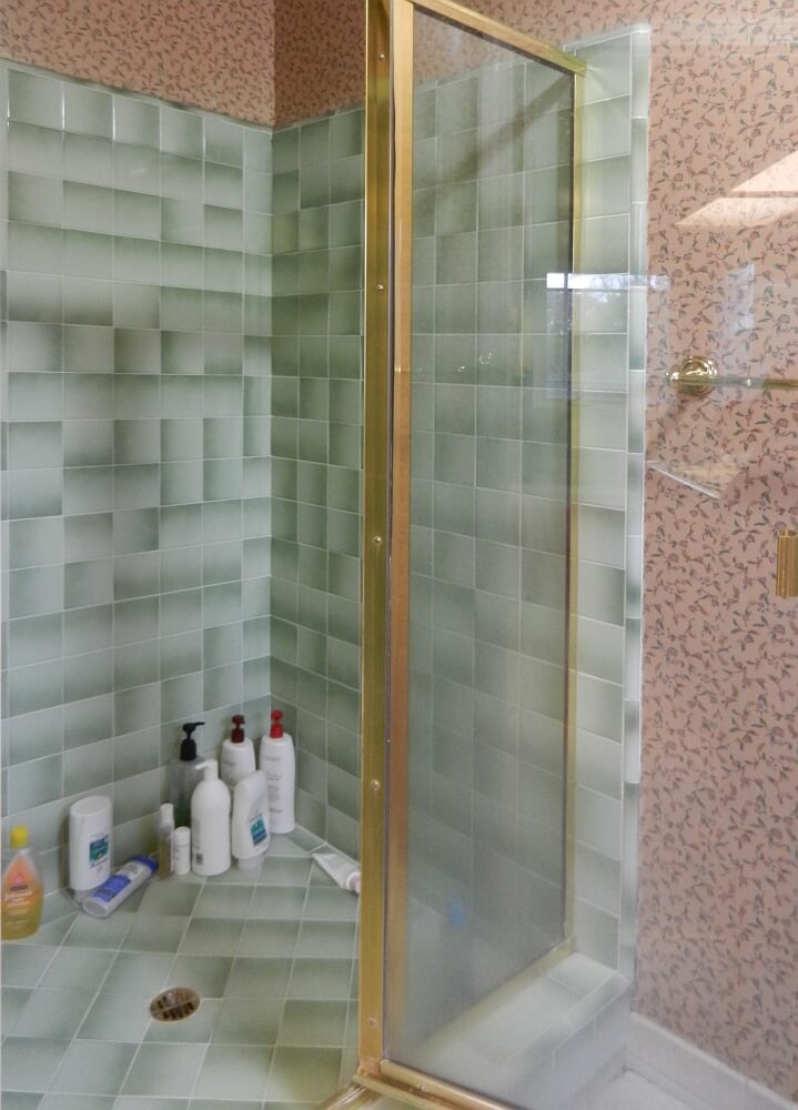 Elegant etched glass sidelight infuses the master bathroom with an airy look.