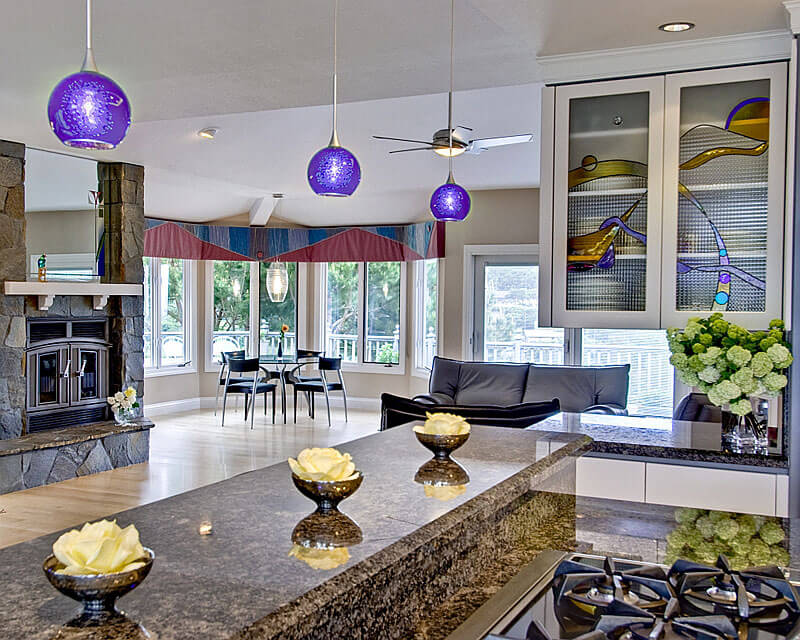 Dichroic glass, which shifts in color when viewed from different angles, creates visual interest in the kitchen cabinet. The whimsical crystal jewel in the etched glass is a nod to the clients' extensive Swarovski collection.